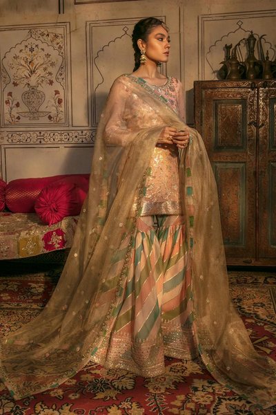 This peach gharara and kameez set from Faiza Saqlain's Festive Edit'22 collection is a stunning blend of elegance and artistry. The self-embellished shimmery fabric of the kameez is complemented by multi-hued organza appliqué on the gharara, creating a captivating look. Paired with a tulle dupatta adorned with thin gotta taar and sequins, this ensemble is perfect for festive occasions. Its premium badla chiffon, zari net, and jute net fabrics ensure a timeless addition to your wardrobe, exuding sophistication and charm.