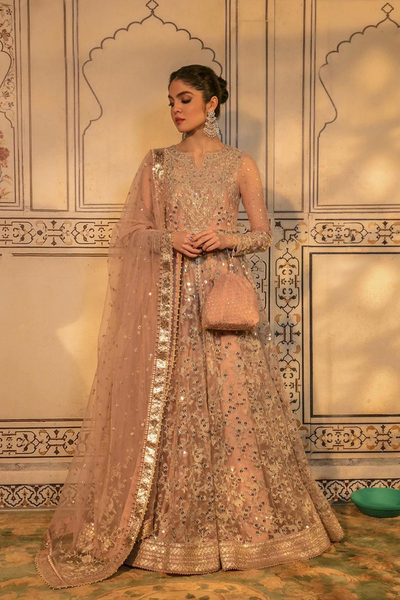 This blush pink tulle pishwas set from Faiza Saqlain's Festive Edit'22 collection is a stunning choice for festive elegance. The pishwas features a fully embroidered flower-patterned fabric, embellished with sequins, gotta trims, and intricate work around the neckline. Paired with an embroidered net dupatta edged with gotta patti and a cotton silk churidaar pajama, this ensemble exudes charm and sophistication. Its premium fabric and exquisite craftsmanship make it a timeless addition to your wardrobe.