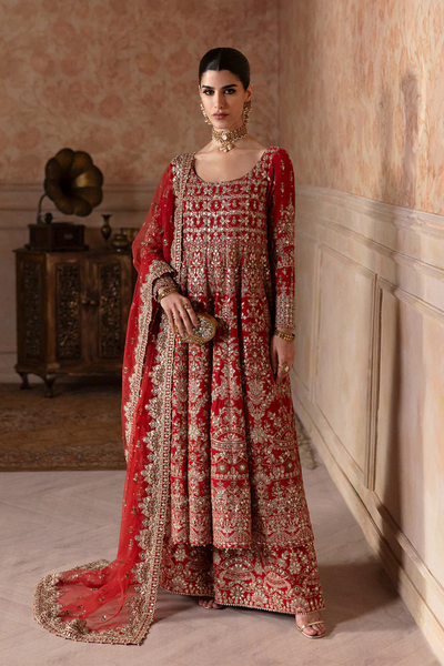 Erna by Faiza Saqlain - Ismene'24 is a stunning fusion of immaculate artistry and craftsmanship. Crafted from opulent aubergine velvet, the shirt and culottes are adorned with intricate tilla, dabka, and pearl detailing, making them truly dazzling. Paired with a magnificently ornamented banarasi shawl featuring rich dabka and gota work, this set exudes festive elegance. Perfect for the holiday season, Erna combines luxury and timeless appeal, making it a must-have addition to your wardrobe. Guaranteed 100% original, with shipping in 6 to 8 weeks.