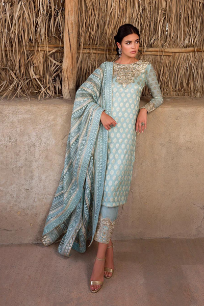 Saahi from the Faiza Saqlain Laira Festive Luxury Edit '23 collection evokes the charm of yesteryear with its exquisite detailing. The ensemble features intricate tilla, resham, and mirrorwork on a delicate mint-blue base, making it an embodiment of timeless elegance. The embroidered paper silk shirt is complemented by Korean raw silk trousers and an embroidered organza dupatta, creating the perfect festive-wear piece. With its rich craftsmanship and sophisticated hues, Saahi is a statement of luxury and tradition, designed for special occasions.