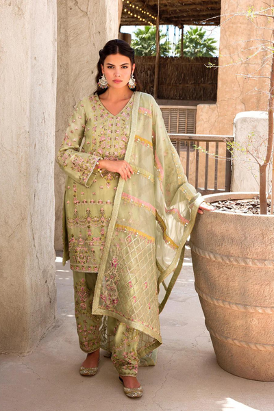 The Faiza Saqlain Laira Festive Luxury Edit '23 introduces Noya, a striking embodiment of luxury and craftsmanship. Featuring intricate shimmering mirrorwork, delicate thread, and tilla embroidery, this ensemble is a true work of art. Crafted on a pistachio canvas, the embroidered cotton net shirt pairs flawlessly with a buttery organza dupatta, adding a touch of grace and elegance. Completing the look, the set includes Korean raw silk culottes, ensuring both comfort and style in a sophisticated, contemporary silhouette. Perfect for special occasions, Noya blends traditional techniques with modern design seamlessly.
