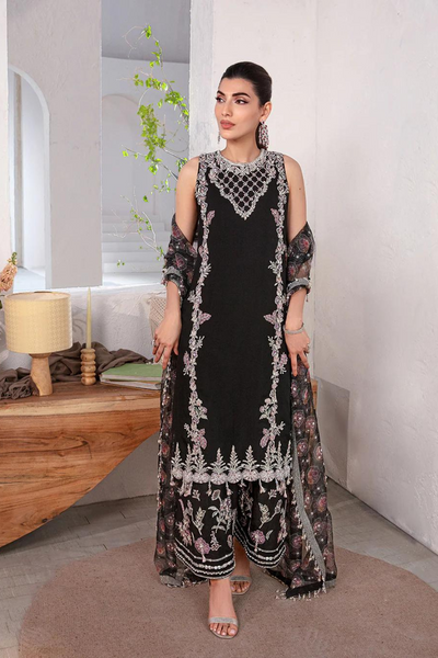 Cherine from Faiza Saqlain Lenora Luxury Pret"24 seamlessly blends tradition with contemporary allure. This exquisite black chiffon shirt features meticulously crafted floral vines, elevated by intricate gota, resham, and pearl work, showcasing timeless craftsmanship. Paired with embroidered and embellished Korean raw silk culottes, the ensemble exudes modern maximalism. The printed organza dupatta, rich with embellishments, serves as the focal point of the outfit, adding an ethereal and refined touch. Cherine is a celebration of opulence and artistic heritage, making it the perfect choice for an elegant evening or a grand festive occasion.