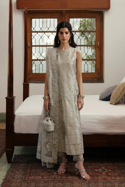 Damaris ensures a perfect blend of traditional craftsmanship and contemporary design, captivating with its stone grey hue. The soft tissue shirt is adorned with intricate sequins and tilla accents, creating a subtle yet striking effect. Paired with a translucent embroidered organza dupatta and Korean raw silk trousers, this ensemble brings together a harmonious mix of textures and patterns. The result is a refined and elegant look, ideal for formal celebrations. Damaris is a celebration of timeless beauty and modern sophistication, perfect for those looking to make a graceful statement.