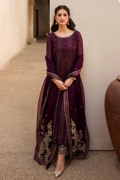 Yashal celebrates the elite craft of tilla embroidery, blending elegance with sophistication. The embroidered chiffon shirt is a masterpiece, adorned with intricate motifs that add depth and richness. The embroidered organza dupatta exudes femininity, perfectly complementing the ensemble. Paired with embroidered Korean raw silk culottes, this outfit exudes a bold, modern flair. The deep plum hue makes a striking statement, ensuring you stand out at any occasion. Yashal is the perfect fusion of traditional craftsmanship and contemporary style, ideal for those who seek sophistication and luxury.