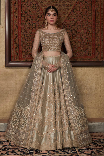 Faiza Saqlain 'Sanaz' Formal Collection presents a scintillating Ivory Lehnga Choli Set. The ensemble features intricate embellishments using pita, naqshi, and sheesha techniques. The lehnga is adorned with bejeweled floral vines, creating a captivating look, while the choli is crafted from embellished chiffon, complemented with net sleeves. Paired with an embroidered net dupatta, this set radiates timeless elegance. Made with luxurious tissue fabric, this three-piece stitched ensemble is a must-have for your festive wardrobe. Authenticity guaranteed.