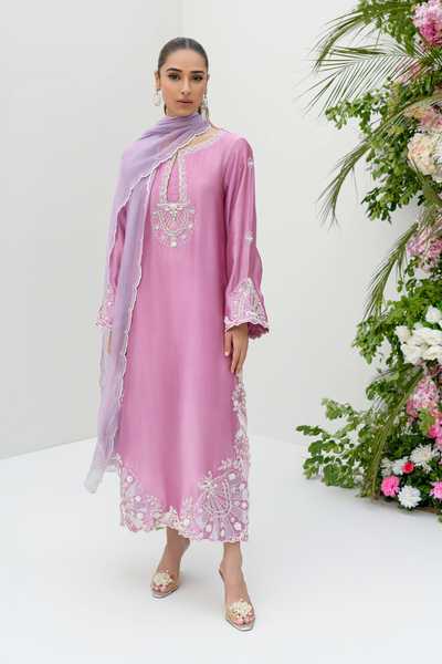 The Mauvy and Lilac ensemble combines soft pastels and intricate embroidery for a refined, sophisticated look. Crafted from premium pure sheesha silk, the soothing mauve pink shirt is paired with a striking lilac dupatta for a beautiful contrast. Delicate white embroidery adorns the neckline, sleeves, and borders, enhancing the elegance of the design. This ensemble offers a harmonious blend of soft colors and luxurious craftsmanship, making it a perfect choice for those seeking grace and sophistication. 100% original and authentic by Flairs Studio- Freya.