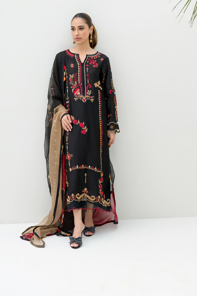 The Marvi dress is a perfect fusion of traditional elegance and modern style. Crafted from premium pure sheesha silk, the ensemble features a shirt and izaars in a sophisticated palette of cranberry red, coal black, and coffee beige. The dress is beautifully adorned with appliqués and mirror work, showcasing intricate craftsmanship and a contemporary touch. Paired with a pure organza dupatta, this outfit radiates timeless beauty while embracing modern sophistication. Perfect for those who seek a blend of classic and contemporary styles. 100% original and authentic by Flairs Studio- Freya.