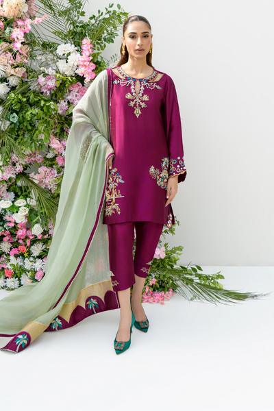 This striking ensemble features a deep plum violet-colored short shirt, offering a rich and regal hue that exudes sophistication. Paired with skinny modern shalwar, the outfit is accentuated by a bold flamingo motif along the edge, adding a touch of artistic flair. The look is completed with a sage green dupatta, delicately adorned with palm tree embellishments along its borders, bringing a tropical charm to the design. Crafted from pure sheesha silk and organza, this outfit from Flairs Studio- Freya blends vibrant colors with intricate embroidery for a bold, eye-catching statement. 100% authentic.