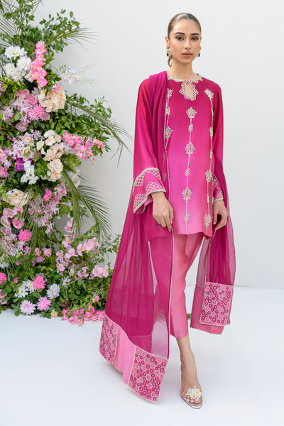 The Shades of Pink ensemble presents a bold ombre effect in vibrant raspberry pink hues. Crafted from luxurious pure sheesha silk, the short shirt is adorned with intricate Swarovski embellishments, adding a touch of glamour. Paired with slim-cut shalwar for a sleek, modern silhouette, this outfit is complemented by a matching dupatta, also embellished with sparkling stones and detailing. This chic and fashionable design exudes contemporary elegance, making it an ideal choice for those seeking a stylish and sophisticated look. 100% authentic from Flairs Studio- Freya.