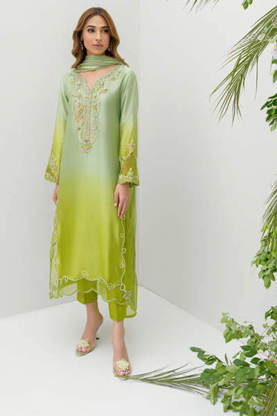 This exquisite ensemble features a lime-colored ombre long shirt that seamlessly transitions from a lighter to a deeper green, paired with straight, narrow-cut pants for a sleek look. Crafted from luxurious pure sheesha silk, the outfit radiates elegance. An organza dupatta adds a graceful touch, while intricate silver kora work and Swarovski embellishments along the hemline, border, and dupatta enhance the outfit's sophistication with a refined sparkle. Perfect for a special occasion, this ensemble is a blend of modern style and classic luxury. 100% authentic from Flairs Studio- Freya.
