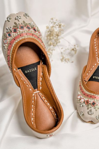 The Empress is an epitome of handcrafted luxury and traditional workmanship. It is extravagantly embellished with cut glass beads, dabka and precious pearls using traditional zardozi techniques. Upper and Back- Pure Indian Raw silk with embellishments Lining and sole- Fine leather Cushioning- Double padded sole and back for some extra comfort to avoid blisters