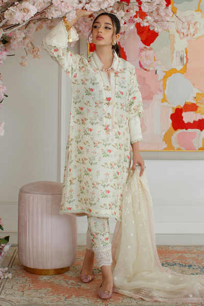 Farah Talib Aziz's Cool Cool Summer collection presents the Rosalie Eden set, a dreamy and feminine choice for the season. Crafted from pure raw silk, it features a beautiful floral pattern in soft pastel hues. The relaxed fit, complemented by playful statement sleeves, offers both comfort and style. The elegant neckline detailing and the delicate organza dupatta with eyelet embroidery add a touch of charm. Complete your look with the coordinated Rosalie Ivy pants and cute pink flats for a whimsical, eye-catching ensemble perfect for any occasion.