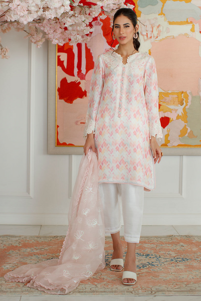 Farah Talib Aziz's Cool Cool Summer collection introduces the Ikat Mia set, expertly blending comfort with chic style. Crafted from pure raw silk, this set showcases a striking Ikat print in soft peach, pink, and aqua shades, inspired by abstract watercolors. The kurta features a beautifully embroidered neckline and sleeves, adorned with dreamy pearl accents. Its universally flattering silhouette is perfect for any occasion. The airy pale pink organza dupatta, decorated with translucent sequins, adds a touch of sparkle. Pair it with the matching silk pants for a cool, effortless summer look.