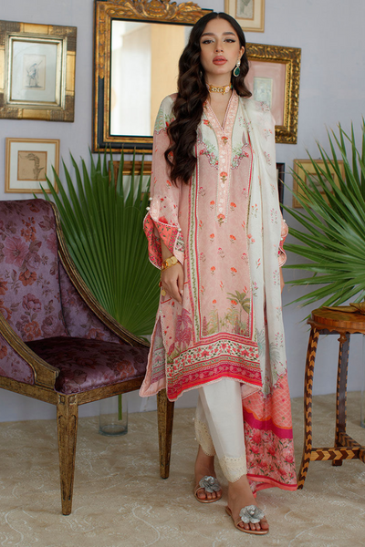 Presenting a must have collection, filled with distinctive, quintessentially FTA prints. All masterfully tailored to be worn and loved for years to come. Our feminine and floaty summer sets are your easy solution to looking most perfectly put together. The Meher Coral Annar Set has a canvas of uplifting petal pink, illustrated with a captivating magenta details and palms swaying in a soft green. Hand crafted floral motifs adorn the neckline and sleeves. The pure medium silk dupatta is ivory with candy pink and magenta florals blooming all over. Complete your set with our embroidered, pure silk shalwar (as shown) and some sparkly flats for an unforgettable look. ADD ON PANTS- 8,500/-