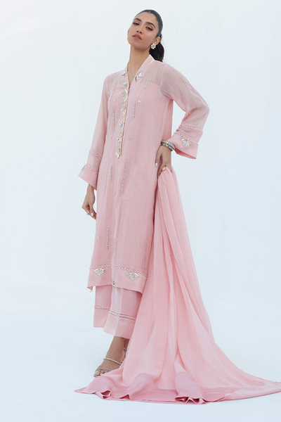 Embrace effortless elegance with the Farah Talib Aziz LEA Spring'23 soft pink ensemble. Crafted from delicate pure chiffon, the relaxed silhouette is beautifully adorned with silver and gold mukesh floral embellishments along the neckline, sleeves, and daaman. Luxe charmeuse silk trimming adds a sophisticated touch. The coordinating chiffon dupatta in soft pink completes the look with airy grace. Pair it with the optional embroidered pants (as shown) and minimal earrings for a stunning, versatile outfit perfect for any occasion. 100% original. Authenticity guaranteed.