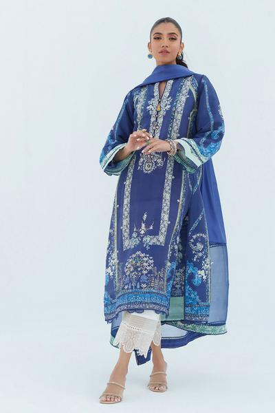 The Simi ensemble from Farah Talib Aziz's LEA Spring '23 collection exudes elegance and timeless appeal. Crafted from lapis lazuli blue raw silk, this piece is beautifully illustrated with an ivory print and light aqua borders. The relaxed, universally flattering silhouette features a neckline adorned with delicate hand-made floral motifs, pearls, sequins, and schiffli organza edging. Paired with a coordinating pure medium silk dupatta in cool blue, trimmed with organza borders embroidered with ivory blooms, this ensemble is completed with pure silk schiffli pants (as shown). Sparkly heels will elevate the look, making it perfect for any occasion.