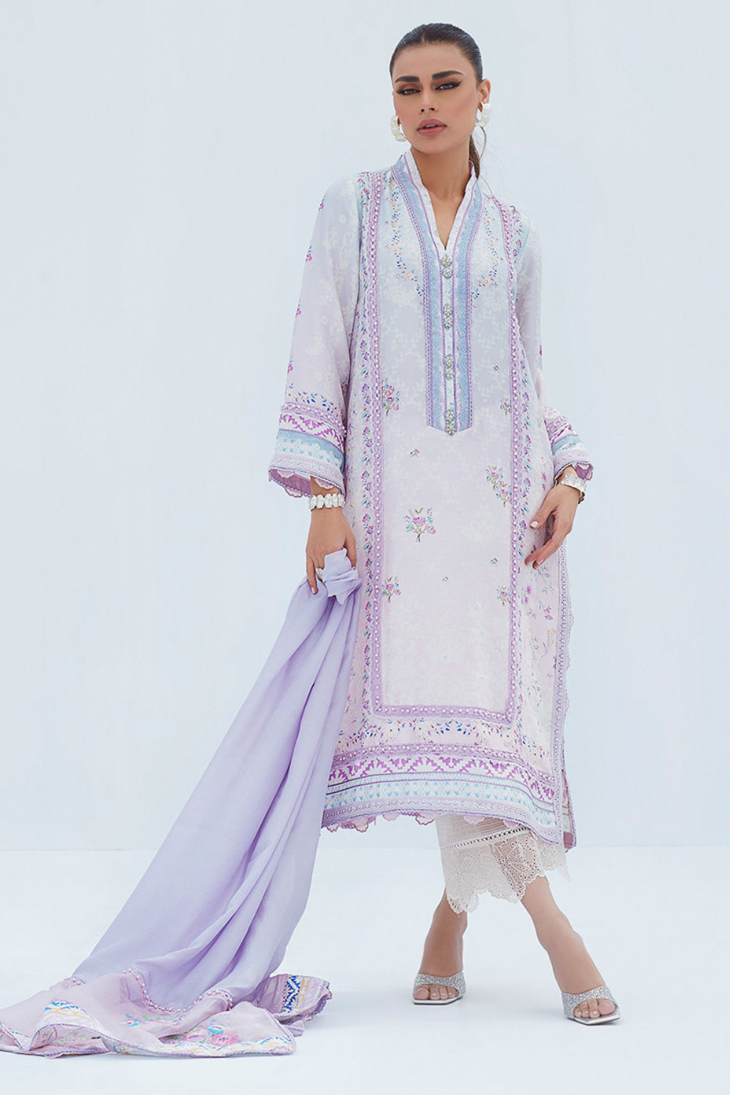 The Liz ensemble from Farah Talib Aziz’s LEA Spring '23 collection is a true masterpiece, perfect for the festive season. Cut from sumptuous raw silk, the design features an ombre treatment that gracefully transitions from soothing wedgewood blue to a gorgeous lavender hue. The universally flattering silhouette is adorned with delicate hand-made floral motifs, pearls, sequins, and scalloped schiffli organza edging. Paired with a pure medium silk dupatta in light lavender, trimmed with organza and vibrant embroidered blooms, and complemented by pure silk schiffli pants (as shown), this chic look is finished with voluminous waves for a timeless, sophisticated vibe.