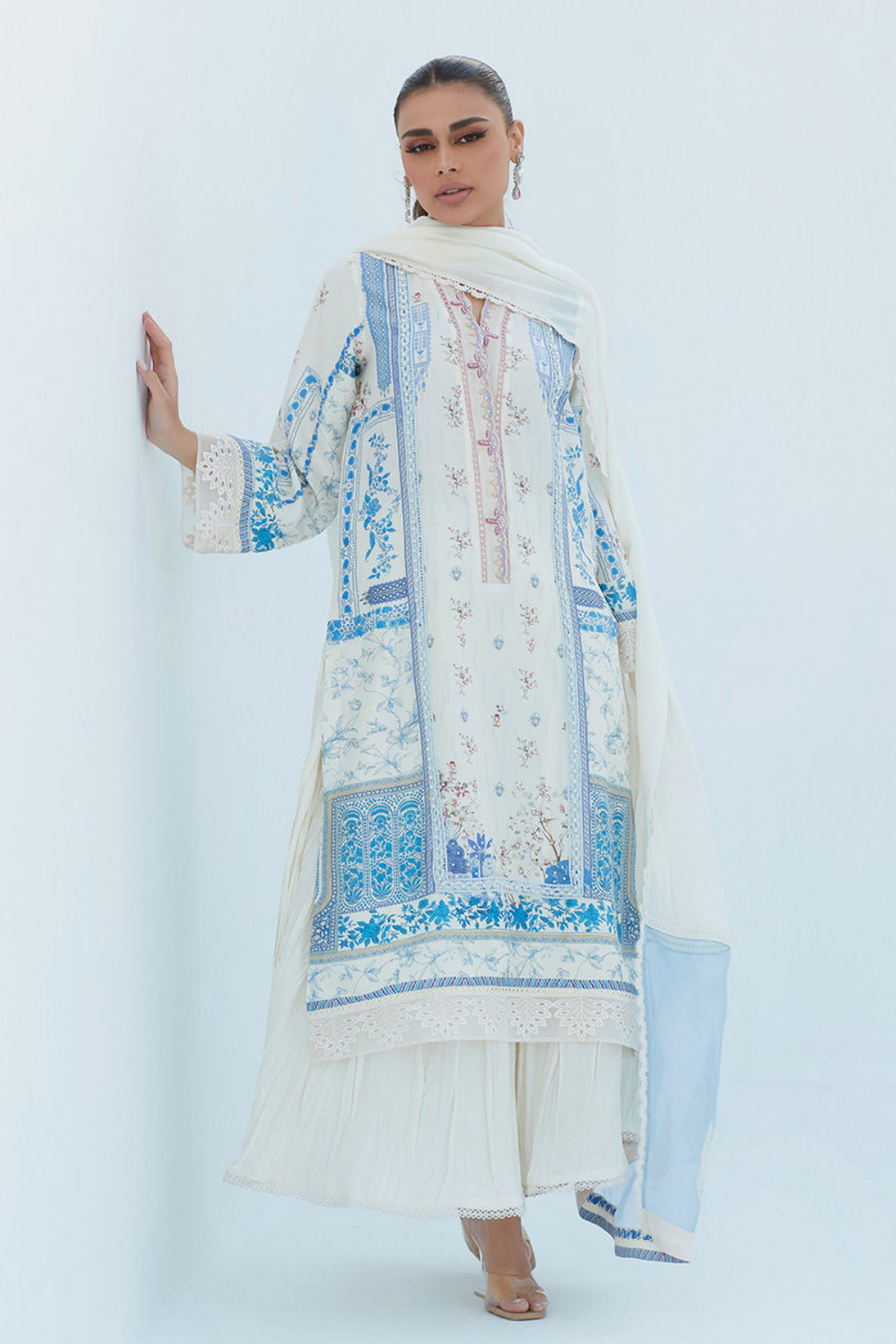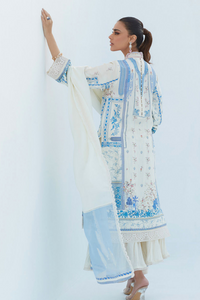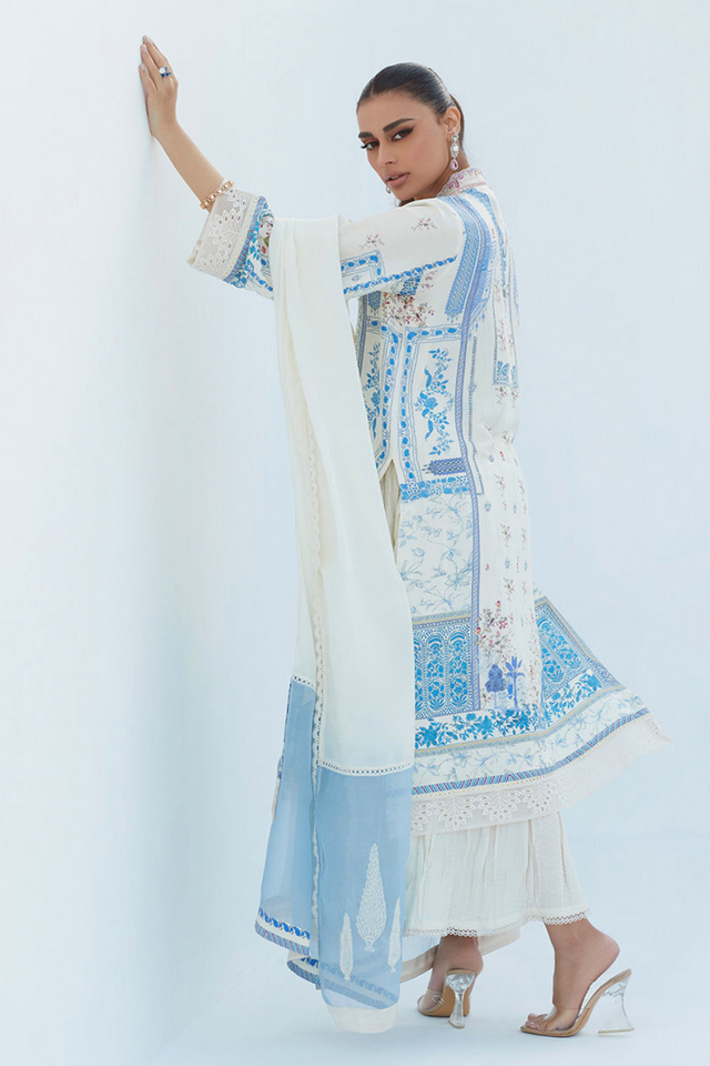 The Erica ensemble from Farah Talib Aziz’s LEA Spring '23 collection is an exquisite fusion of elegance and whimsy. Crafted from luxurious ivory raw silk, it features stunning floral and geometric prints in captivating blue hues. The relaxed silhouette is enhanced with a universally flattering neckline, adorned with delicate hand-made floral motifs, pearls, sequins, and schiffli organza edging. Paired with a pure medium silk dupatta in pristine ivory, trimmed with embroidered blue organza, this set offers timeless sophistication. Complete the look with crushed silk pants for an ultra-glam statement.