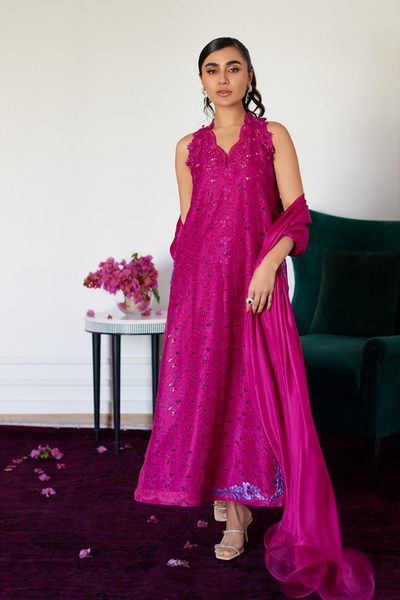 The "Clariene" ensemble from Farah Talib Aziz's Luxe Pret'24 collection is a show-stopping choice for modern elegance. Crafted from sleek raw silk in a vibrant hot pink, it features FTA's signature schiffli design with a high scallop V-neckline, adorned with sequins, beads, pearls, and 3D floral embellishments. The hem is highlighted by a contrasting purple floral border. Paired with a flowy medium silk dupatta finished with organza ruffles, this outfit exudes a dreamy, lustrous charm. Complete the look with matching straight raw silk pants and silver statement earrings for a standout appearance.