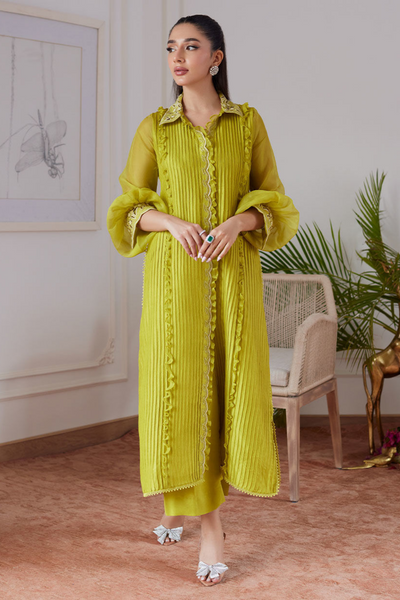Faustine captures understated elegance in a refreshing kiwi hue, reimagining monotone fashion with modern finesse. The raw silk straight shirt is beautifully pleated and detailed with delicate short ruffles, while a tailored collar and cuffs shine with cutwork and pearl embellishments. Voluminous organza balloon sleeves bring a romantic, fashion-forward flair. The ensemble is completed with a perfectly tailored raw silk izar, balancing structure and grace. Effortlessly chic, Faustine is ideal for daytime elegance or evening sophistication, making it a timeless choice for the modern muse who embraces bold color with graceful style.