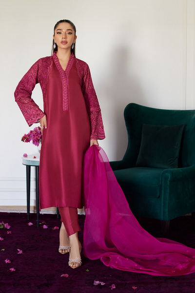 Radiate refined charm in this striking magenta outfit from Farah Talib Aziz Luxe Pret'24, designed to effortlessly transition from daytime elegance to evening glam. The pure raw silk shirt features a sophisticated talpat neckline, hand-embellished for a delicate shimmer, while the standout cutwork sleeves with schiffli applique add a unique, fashion-forward edge. Paired with tailored raw silk pants for a flattering fit, this ensemble promises both comfort and couture appeal. The look is completed with a sheer organza dupatta, adorned with embroidered pallus and lace detailing—making it a must-have statement piece for any celebratory wardrobe.