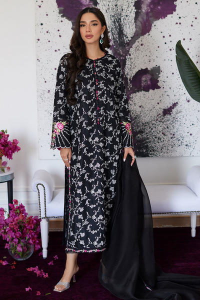 Embrace the timeless allure of this black pure raw silk shirt from Farah Talib Aziz Luxe Pret'24, fully embroidered with a stunning white floral jaal and adorned with floral patches at the sleeves and hem. The embellished neckline, featuring sequins and beads, elevates the festive appeal. Paired with tailored raw silk pants finished with an embroidered border, the outfit is complemented by an organza dupatta, adding a touch of sheerness and vibrant color through its intricate borders. This enchanting ensemble is the perfect blend of modern elegance and classic festive charm.