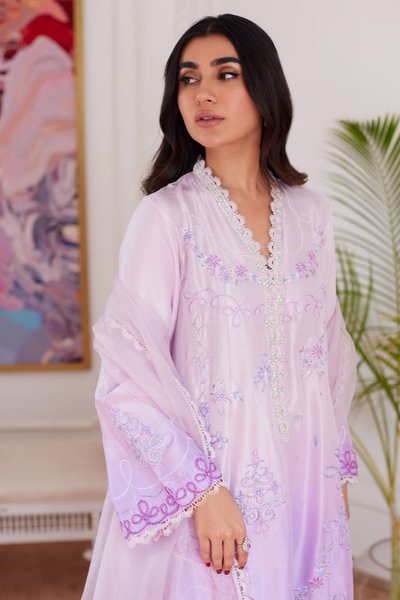 Embrace timeless elegance with this pastel pink ombre raw silk ensemble from Farah Talib Aziz Luxe Pret'24. Transitioning beautifully into lavender hues, the three-paneled short shirt is intricately embroidered with silk resham, pearls, and sequins. The flattering V neckline in talpat style complements the A-line silhouette, while the Dori borders at the hem and sleeves elevate the design. Paired with a tailored raw silk shalwar and a three-toned organza dupatta featuring Dori detailing, this ethereal piece is the perfect choice for your spring festivities, radiating grace and sophistication.