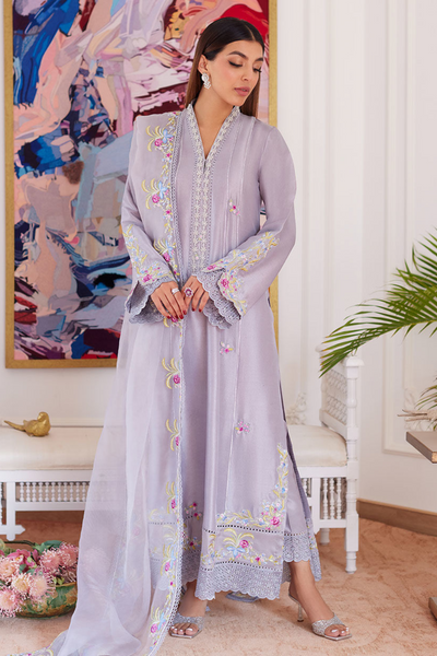 Embody modern elegance with this silver-grey ensemble from Farah Talib Aziz Luxe Pret'24. The five-paneled long kiladar exudes effortless class with its flattering pearl-embellished neckline and voluminous silhouette. The hem and sleeves are adorned with contrasting floral borders, enhancing the romantic aesthetic. Paired with pure raw silk pants featuring intricate schiffli borders, this look is completed with an organza dupatta. The dupatta is delicately embellished with floral resham borders, elevating the elegance of this outfit. This chic and timeless ensemble is an essential addition to any wardrobe, combining sophistication with refined grace.