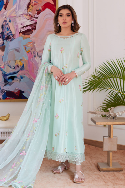 Elyssia from Farah Talib Aziz Luxe Pret'24 is a five-paneled mint-colored kiladar that radiates elegance and freshness, perfect for spring celebrations. Crafted from pure raw silk, the shirt is adorned with intricate pearl and Swarovski crystal embellishments on the neckline and sleeves. The voluminous hem is beautifully finished with an organza schiffli border, adding graceful movement. Paired with matching raw silk pants featuring the same schiffli detailing, this ensemble is completed with a stunning organza dupatta. The dupatta is accented with resham floral threadwork, offering a vibrant pop of color and enhancing the pearl and embroidered accents.