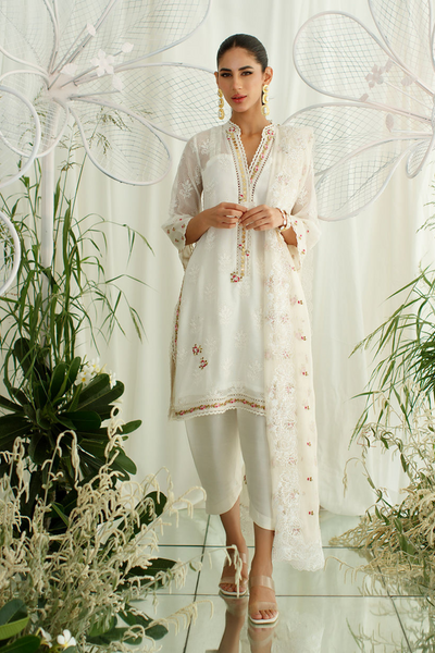 The Ivory Cotton Net ensemble is the epitome of romantic elegance, adorned with cross-stitch blooms in Bougainvillea pink. The hand-embellished neckline is delicately decorated with glistening gold kaamdani, adding an enchanting sparkle. The airy, diaphanous organza dupatta, dotted with cross-stitch rosettes and trimmed with delicate lace, completes the look with graceful flair. Pair it with the Zennie Shalwar in pure silk, and style with a sleek high ponytail for a standout appearance at any occasion.