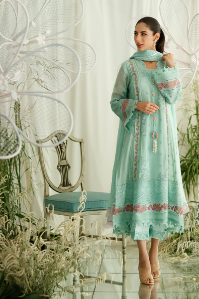 The Valentina ensemble is the perfect blend of romantic whimsy and timeless elegance. Crafted from aqua cotton net, it features delicate cross-stitch embroidery along the neckline and shirt, enhanced with hand-crafted FTA details. The daaman is beautifully adorned with eyelet embroidery and cross-stitch flowers. A coordinating pure medium silk dupatta adds a graceful flair to the look. Pair this ensemble with matching pants and a sleek ponytail for a head-turning appearance at any occasion.