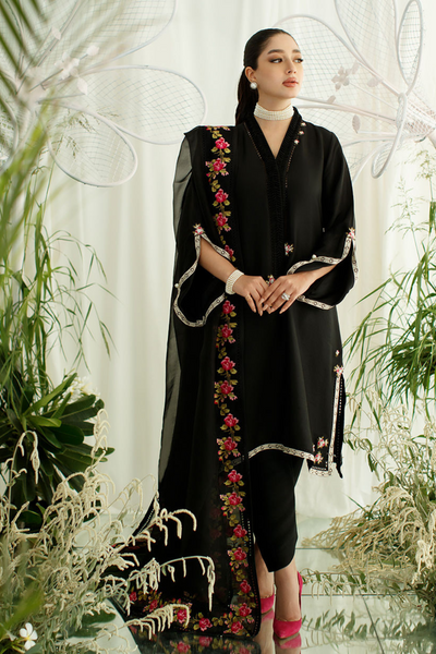 This timeless ensemble features irresistibly romantic florals and luxe fabrics that redefine simplicity. The pure obsidian raw silk shirt is adorned with handcrafted floral designs and delicately edged with ivory embroidery. The airy organza dupatta, trimmed with a richly embroidered cross-stitch floral border, adds an ethereal touch. Pair it with the Zennie shalwar in black and a bold statement choker for a refined and memorable look.