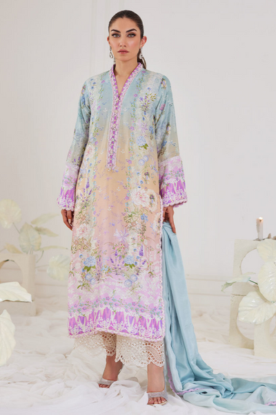 Introducing the Ombre Floral Ensemble from Farah Talib Aziz Tara Eid Luxe'24. Crafted from sumptuous raw silk, this shirt features a stunning ombre effect, transitioning from ice blue to a peachy tone and soft lavender. Whimsical florals bloom delicately across the fabric, adding a touch of charm. The relaxed silhouette, with its universally flattering neckline, is enhanced with handmade floral motifs, pearls, and sequins for timeless elegance. The look is completed with a coordinating ice blue pure medium silk dupatta. Pair it with our embroidered cutwork pants for a perfect, graceful ensemble that exudes effortless beauty.