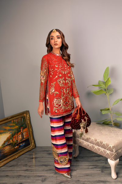 This elegant ensemble by Haute Form Studio features a boxy-fit shirt with side long slits, paired with fitted sleeves and a crew neck for a modern, relaxed silhouette. The outfit is complemented by sleek bootcut pants, offering a balanced and flattering fit. Intricately hand-embellished with pita work and 3D gold sequence detailing, the design exudes refined luxury. Crafted from pure viscose and Indian raw silk, this outfit is a perfect blend of sophistication and contemporary style. A plain dupatta can be added on demand. Made with 100% original, authentic fabric.