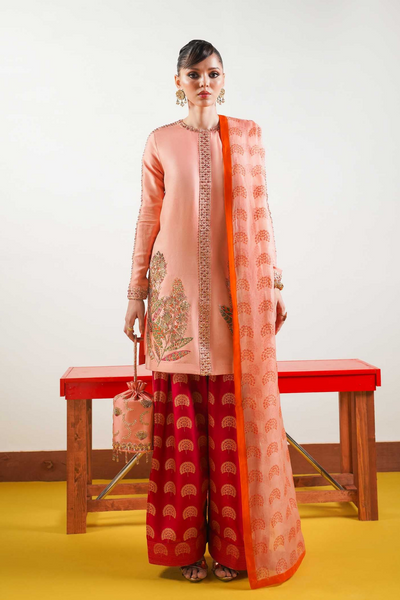 This enchanting ensemble from Hussain Rehar's Basic Not Basic Vol-IV'23 collection is the epitome of elegance and charm. The short raw silk shirt in a delicate light pink hue is adorned with intricate pita work, gold sequins, and a delightful mix of light pink, green, magenta, and gold buggle beads. Paired with vibrant hot pink printed shalwar, the outfit radiates sophistication with a playful touch. The light pink printed organza dupatta with four-sided finishing completes the look beautifully. For an extra flair, pair it with Hussain Rehar's signature potli bag. Guaranteed 100% authentic, this outfit is perfect for making a stylish and graceful statement at any occasion.