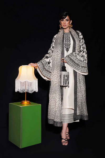 This elegant ivory ensemble from Hussain Rehar's Basic Not Basic Vol-IV'23 collection is a true testament to sophistication and artistry. The raw silk shirt features an intricately embellished neckline and floral sleeves adorned with ivory and black weaved borders, adding a refined touch to the design. Paired with classic printed ivory culottes, enhanced by a heavy black sequin spray and four-sided borders, this outfit creates a harmonious blend of timeless elegance. Accompanied by a 3-yard organza dupatta, this ensemble guarantees 100% authenticity and is perfect for making a graceful statement at any event.