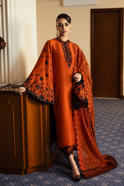 Elevate your style with this stunning rust raw silk shirt, featuring an intricately embellished black screen-printed neckline and heavily adorned floral sleeves for a touch of sophistication. Paired with embellished screen-printed culottes and cutwork detailing at the hems, this outfit offers a perfect blend of modern charm and traditional elegance. Completing the look is a graceful organza dupatta with a multihead sequin jaal. Ideal for festive occasions or upscale gatherings, this ensemble exudes luxury and femininity, ensuring you make a statement wherever you go. 100% Original from Hussain Rehar.