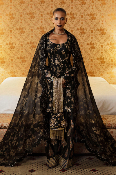 Make a bold statement with this Black Raw Silk Shirt from Hussain Rehar's Basic Not Basic V'24 collection. Adorned with golden screen printing and intricate embellishments, this shirt features loop buttons on the cuffs, elevating its refined appeal. Paired with a black organza dupatta showcasing a delicate multihead border and a screen-printed shalwar, this ensemble exudes elegance. The navy blue chanderi silk poncha with gotta lines adds a stylish contrast. Perfect for festive or evening events, this outfit combines traditional grace with modern flair. 100% Original.