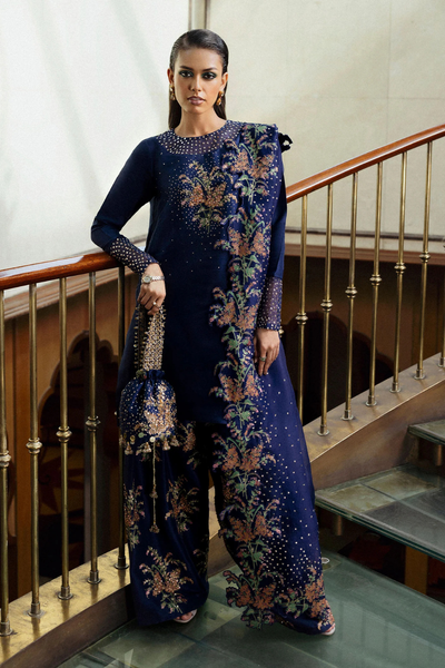 Elevate your style with this Navy Blue Raw Silk Short Shirt from Hussain Rehar's Basic Not Basic V'24 collection. The shirt features a stunning screen-printed floral bunch at the center, enhanced with delicate sequin organza on the neckline and sleeves, adding a touch of sparkle. Paired with a screen-printed raw silk shalwar and an organza dupatta, both embellished to complement the shirt's floral design. This outfit effortlessly blends modern aesthetics with traditional charm, perfect for festive events or special gatherings. 100% Original.