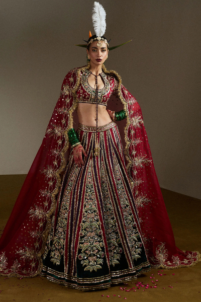 Turn heads in our unique double-colored velvet lehnga, showcasing rich red and bottle green pyramidal panels with intricate hand embellishments. Paired with a hand-embellished pure raw silk choli and a luxurious pure organza dupatta, this ensemble exudes elegance and sophistication. Perfect for any special occasion, it’s a true masterpiece of style.
