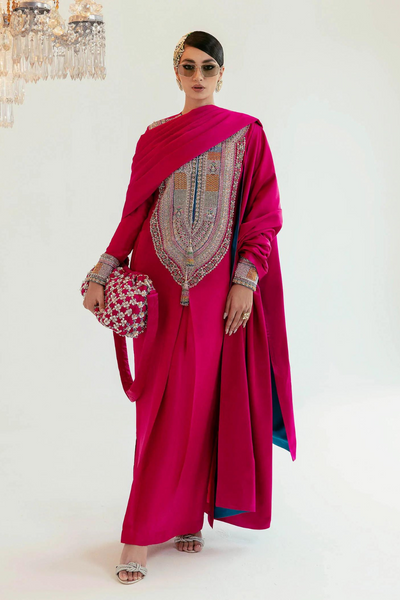A stunning creation from Hussain Rehar’s Chamak Dhamak collection, this hot pink raw silk shirt is a statement of elegance and vibrance. Intricately embellished with ice-blue, pink, orange, mustard, and green cutdana, sequins, nakshi, and pipework, it features a central box pleat for a graceful fall. The tassels and cuff detailing add a refined charm. Paired with an optional satin silk shawl in hot pink, lined with teal, the outfit is perfect for festive occasions. Shirt length is 58". Available with or without a 3-yard shawl. 100% original.