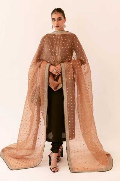 This perfect black raw silk silhouette exudes timeless elegance with minimal yet exquisite embellishments. The delicate detailing on the neckline and cuffs of the sleeves adds a sophisticated touch, making it ideal for both formal and semi-formal occasions. Paired with a classic chooridaar pajama, the ensemble is completed with a beautiful beige dupatta, featuring sequin chatta work and an embroidered embellished border. The elegant combination of raw silk and organza brings a luxurious feel to this ensemble, making it an ideal choice for any special event.