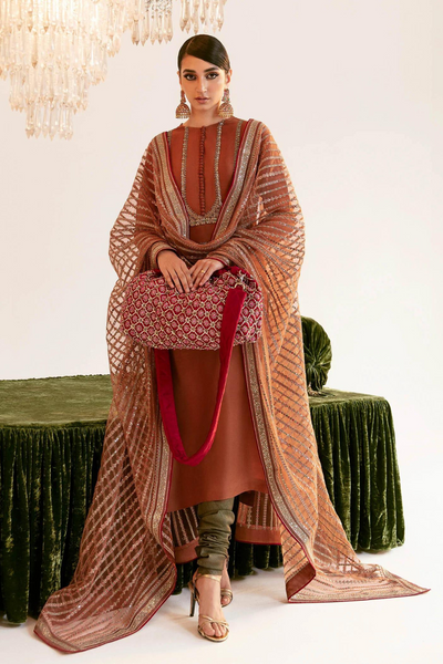 This graciously crafted brown ensemble from Hussain Rehar’s Chamak Dhamak collection is a true statement piece for the upcoming wedding season. The raw silk shirt is adorned with intricate details and delicate work on the front, adding a touch of elegance. The accompanying dupatta, made from net fabric, features exquisite embroidery and borders that beautifully complement the outfit. The ensemble includes a three-piece set with a 46" shirt length, Indian raw silk chooridaar, and a 3-yard net dupatta, making it a perfect choice for any special occasion.
