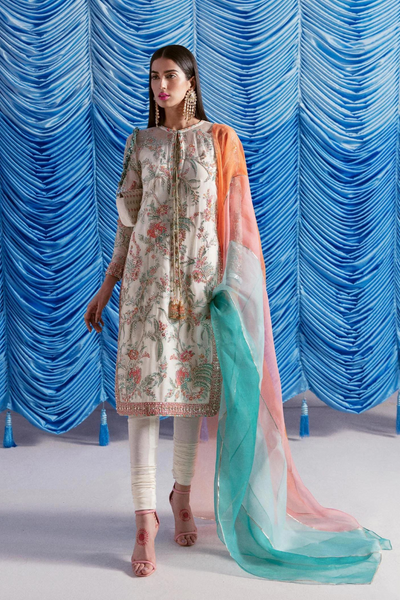 An exquisite ivory ensemble from Hussain Rehar’s Candy Soap Eid Collection '23, crafted in fine organza and adorned with resham embroidery, gold gota, sequins, naqshi, and cutdana in soft pink, peach, and ice blue. Paired with a churidar pajama in Indian raw silk and complemented by a flowing organza dupatta, the outfit is lined with medium silk for added comfort and richness. This elegant attire radiates refined opulence, making it a perfect choice for festive occasions. Guaranteed 100% original designer wear.