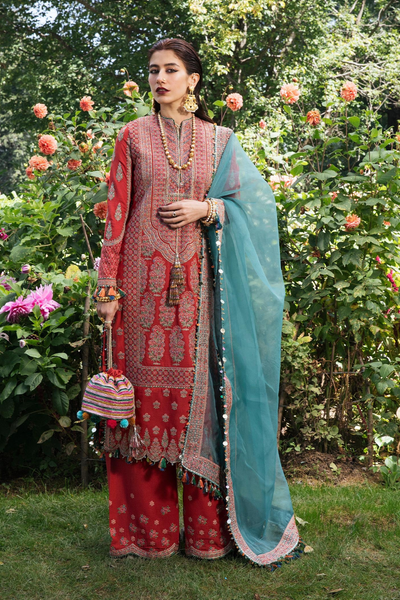 This stunning Karandi unstitched set from Hussain Rehar's Karandi Collection '22 features exquisite Organza dupatta (2.60 meters) with an embroidered pallu (2.23 meters), adding a touch of elegance. The set includes intricately embroidered Karandi panels for the shirt’s front, back, and sleeves, with detailed borders and hem embellishments. It also comes with dyed Karandi trousers (2.50 meters) and printed satin silk finishing for the shirt. The combination of carrot color and rich embroidery offers a perfect blend of sophistication and luxury, with 100% authenticity guaranteed.