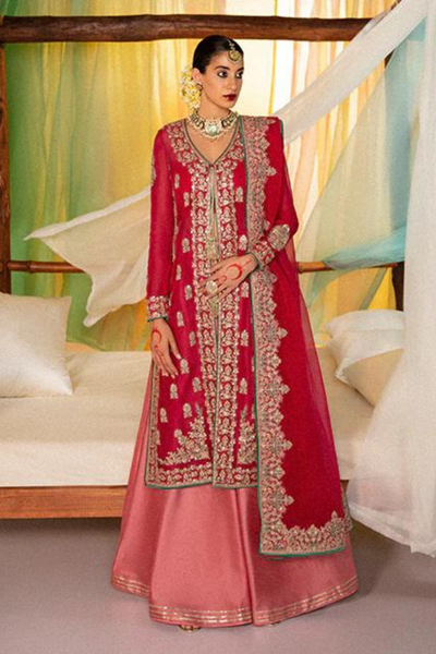 This vibrant shocking pink front-open organza jacket is adorned with intricate borders on the front, back, and all four sides. The front of the jacket is filled with beautiful motifs, adding a touch of elegance. It comes with a plain silk slip for a smooth, comfortable fit. The ensemble is paired with a rose gold silk sharara, featuring a delicate gotta finishing for a refined look. The matching organza dupatta is embellished with a floral border on all four sides, showcasing dabka, nakshi, cutdana, and sequins for a glamorous finish. The jacket measures 45 inches in length, with the sharara measuring 43 inches and the dupatta extending to 2.5 yards, offering a graceful and luxurious silhouette.