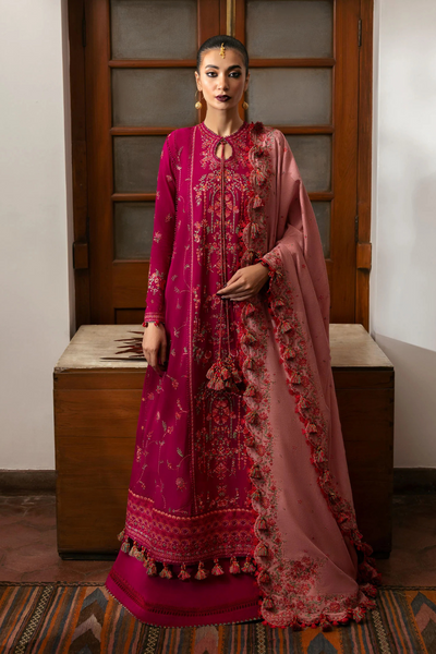 Step into a world of rich hues with this hot pink Karandi ensemble by Hussain Rehar Karandi A/W '24. The intricate embroidery flows seamlessly across the fabric, adding a sense of sophistication and elegance to the outfit. The contrasting shawl and matching trouser elevate the look, making it the perfect choice for those looking to make a bold fashion statement this season. Every detail is carefully crafted to embody timeless beauty.