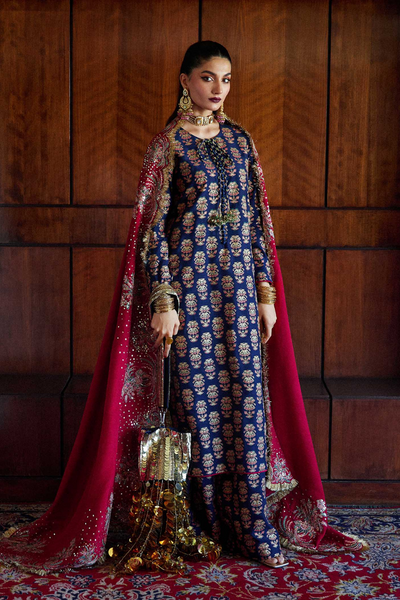 Elevate your style with this striking navy blue ensemble from Hussain Rehar’s Luxury Pret SS/24 collection. The shirt features delicate block-printed booti patterns on the sleeves and body, complemented by loop buttons descending down the neckline and playful tassels. Paired with matching navy palazzo pants, this look is effortlessly chic. The ensemble is beautifully finished with a vibrant red Korean raw silk shawl, adorned with floral scalloped borders and a gold sequin spray. Perfect for any special occasion, this design offers a graceful balance of contemporary and traditional elegance.