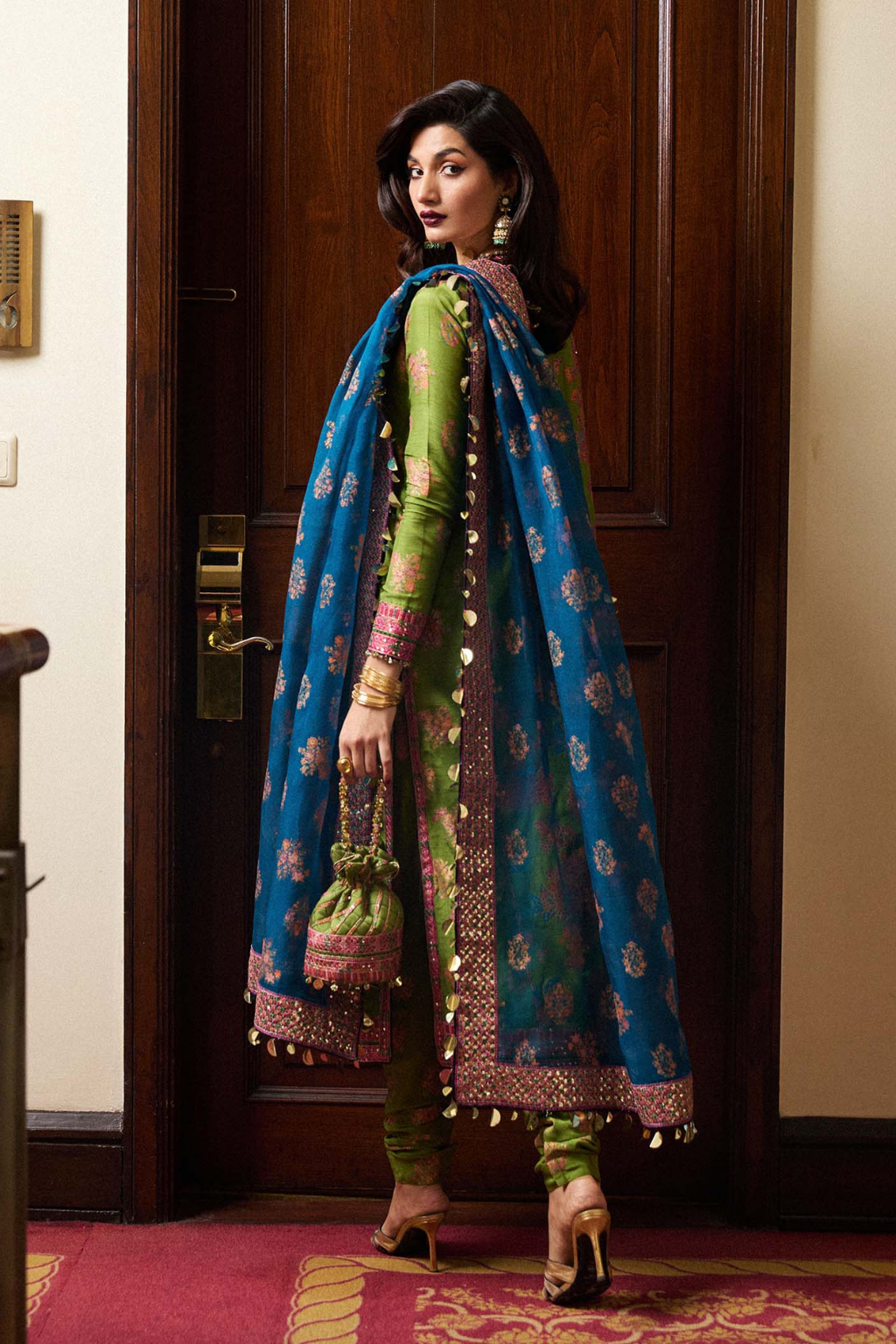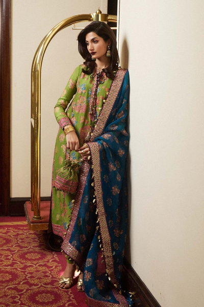 Step into grace with this chic mehndi green shirt from Hussain Rehar’s Luxury Pret SS/24 collection. The shirt features a delicately embroidered and embellished neckline, hem, and inserts, with floral bunches printed on the central panel, and floral bootis adorning the right and left panels and sleeves. Paired with a printed chooridaar and a teal blue organza dupatta, this ensemble is a vision of elegance. The dupatta is beautifully bordered with intricate details, elevating the look with refined beauty. This outfit exudes timeless sophistication, perfect for making an impression at any event.