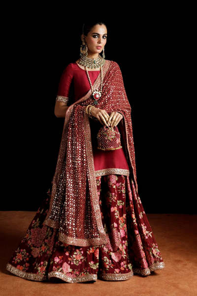This regal maroon raw silk shirt is adorned with delicate golden nakshi, sequins, and pink and green bugle beads on the hems, exuding elegance. It is paired with a beautifully block-printed chiffon sharara featuring similar embellishments on the hem. The ensemble is completed with a heavily embellished multihead dupatta, featuring intricate borders on all four sides. To elevate the look further, a signature Hussain Rehar potli bag can be added, completing this luxurious outfit. Perfect for those seeking opulence and sophistication for special occasions.